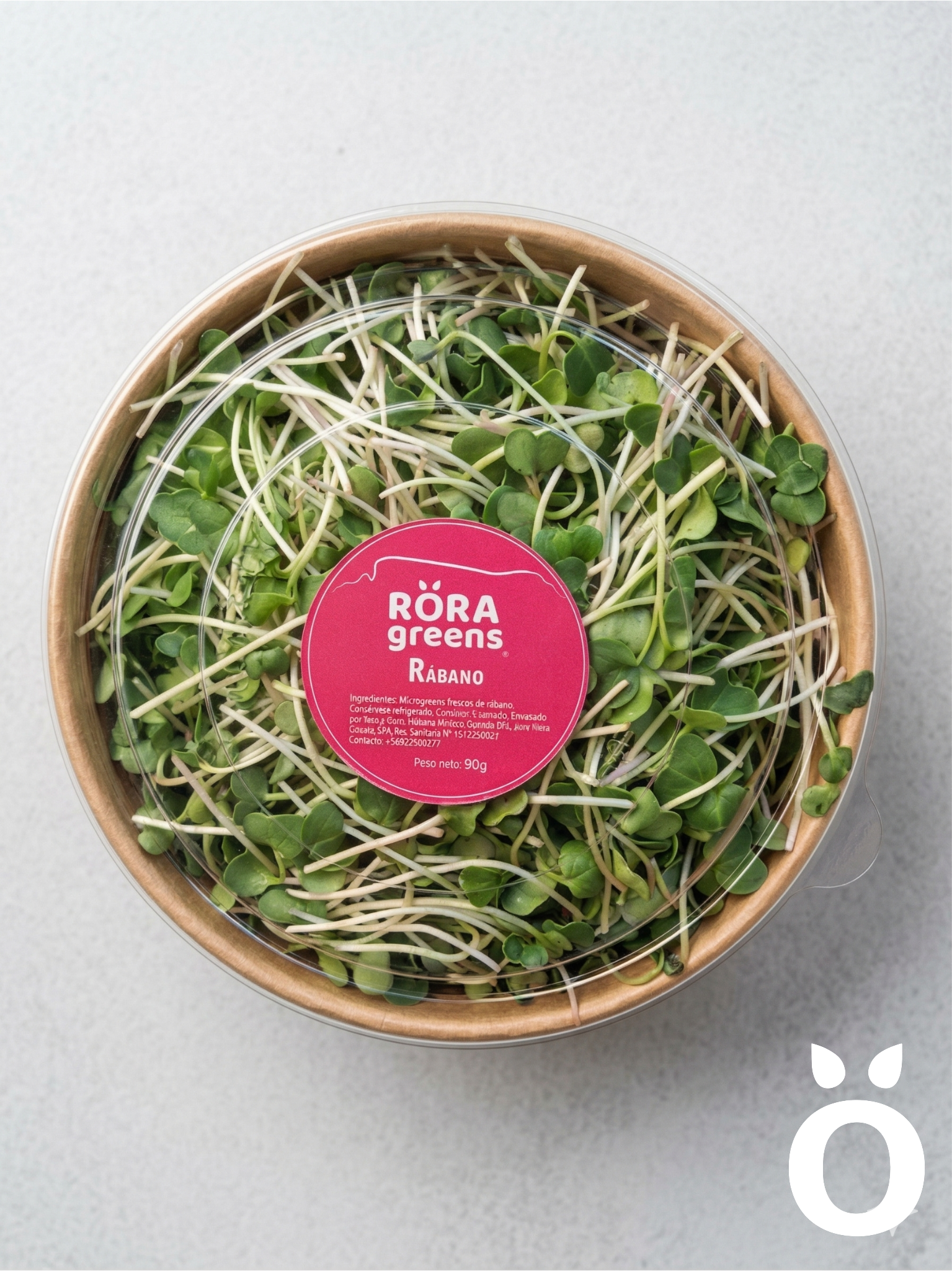 Los microgreens de rábano (Raphanus sativus), son reconocidos por sus tallos de una ligero tono rosado con una hojas color verde intenso. Ofrecen un sabor picante y floral con un toque de dulzura, que los hace únicos. Su textura es crujiente y jugosa al masticar. Además, son una excelente fuente de vitaminas A, B, C, E y K, ácido fólico, niacina, potasio, hierro, fósforo, ácido pantoténico, calcio, magnesio, zinc y carotenos.